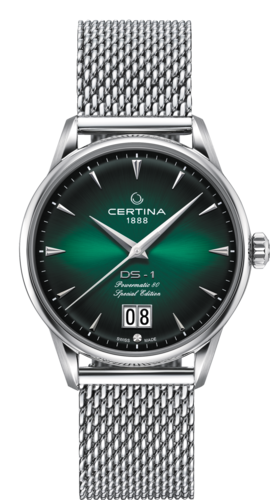 Un anniversaire à célébrer : en 2019, le concept de Double Sécurité (DS) fête son 60ème anniversaire. À cette occasion, Certina présente un superbe modèle spécial doté d’un cadran vert et noir. Le garde-temps, monté sur un bracelet à mailles milanaises, est bien entendu équipé de l’authentique concept DS, garant d’une résistance maximale.