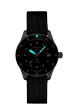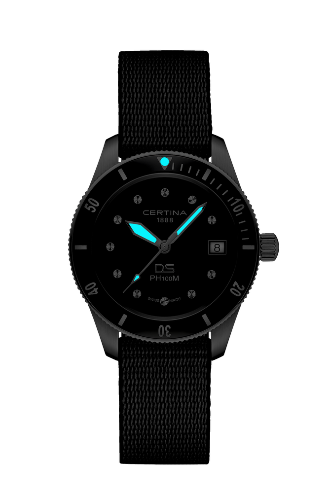Super-LumiNova® (SLN) is a luminescent material with phosphorescent properties. In the dark, the SLN type BG W9 used by Certina emits the light stored as a blue shimmer. SLN does not damage your health in any way and is used in coatings on hands, indices and bezels. It progressively loses its phosphorescence in darkness, but automatically regains it under light.